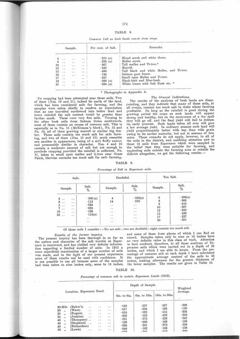 The present inquiry has been thorough in so far as the nature and character of the salt trouble at Esperance is concerned, and has yielded very definite information regarding a limited number of soils. In 1912 a more superficial examination of a larger number of soils was made, and in the light of our present experience some of these results can be used with confidence. It is not possible to use all because some of the samples had been take to nine inches only, some to 18 inches, and some of them from places of which I can find no record. Samples taken only to none or 18 inches have no very definite value in this class of work. Attention is here confined, therefore, to all those analyses of Esperance soils which were carried out to a depth of 36 inches, and which I am able to locate. From the percentage of common salt at each depth I have calculated the approximate average content of the soils to 36 inches, making allowance for the greater thickness of the lower samples. The results are given in Table 10.