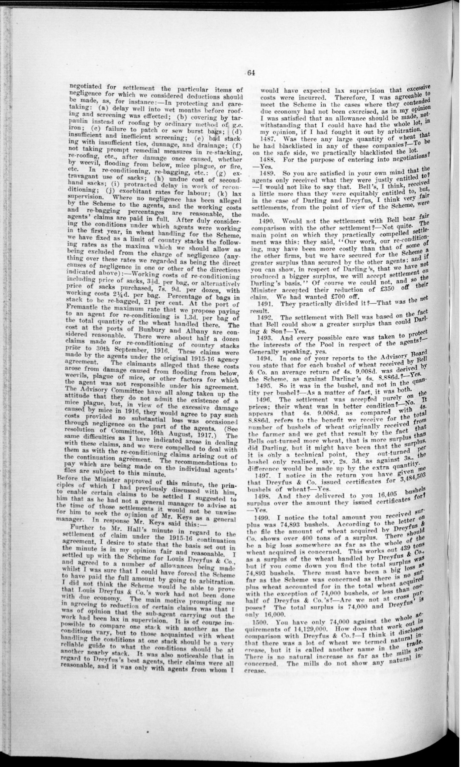 negotiated for settlement the particular items of negligence for which we considered deductions should be made, as, for instance:—In protecting and caretaking: (a) delay well into wet months before roofing and screening was effected; (b) covering by tarpaulin instead of roofing by ordinary method of g.e. iron; (c) failure to patch or sew burst bags; (d) insufficient and inefficient screening; (e) bad stacking with insufficient ties, dunnage, and drainage; (f) not taking prompt remedial measures in re-stacking, re-roofing, etc., after damage once caused, whether by weevil, flooding from below, mice plague, or fire, etc. In re-conditioning, re-bagging, etc.: (g) extravagant use of sacks; (h) undue cost of secondhand sacks; (I) protracted delay in work of reconditioning; (j) exorbitant rates for labour; (k) lax supervision. Where no negligence has been alleged by the Scheme to the agents, and the working costs and re-bagging percentages are responsible, the agents' claims are paid in full. After duly considering the first year, in wheat handling for the Scheme, we have fixed as a limit of country stacks the following rates as the maxima which we should not allow as being excluded from the charge of negligence (any-thing over these rates we regarded as being the causes of negligence in one or other of the directions indicated above):—Working costs of re-conditioning including price of sacks, 3½ d. per bag, or alternatively price of sacks purchased, 7s. 9d. per dozen, with working costs 2¼ d. per bag. Percentage of bags in stack to be re-bagged, 21 per cent. At the port of Fremantle the maximum rate that we propose paying to an agent for re-conditioning is 1.3d. per bag of the total quantity of the wheat handled there. The cost at the ports of Bunbury and Albany are considered reasonable. There were about half a dozen claims made for re-conditioning of country stacks prior to 30th September, 1916. These claims were made by the agents under the original 1915-16 agency agreement. The claimants alleged that these costs arose from damage caused from flooding from below, weevils, plague of mice, or other factors for which the agent was not responsible under his agreement. The Advisory Committee have all along taken up the attitude that they do not admit the existence of a mice plague, but, in view of the excessive damage cause by the mice in 1916, they would agree to pay such costs provided no substantial loss was occasioned through negligence on the part of agents. (See resolution of Committee, 16th August, 1917.) The same difficulties as I have indicated arose in dealing with these claims, and we were compelled to deal with them as with the re-conditioning claims arising out of the continuation agreement. The recommendations to pay which are being made on the individual agents' files are subject to this minute. Before the Minister approved of this minute, the principles of which I had previously discussed with him, to enable certain claims to be settled I suggested to him that as he had not a general manager to advise at the time of those settlements it would not be unwise for him to seek to opinion of Mr. Keys as a general manager. In response Mr. Keys said this:— Further to Mr. Hall's minute in regard to the settlement of claim under the 1915-16 continuation agreement, I desire to state that the basis set out in the minute is my opinion fair and reasonable. I settled up with the Scheme for Louis Dreyfus & Co., and agreed to a number of allowances being made whilst I was sure that I could have forced the Scheme to have paid the full amount by going to arbitration. I did not think the Scheme would not be able to prove that Louis Dreyfus & Co.'s work had not been done with due economy. The main motive prompting me in agreeing to reduction of certain claims was that I was of opinion that the sub-agent carrying out the work had been lax in supervision. It is of course impossible to compare one stack with another as the conditions vary, but to those acquainted with wheat handling the conditions at one stack should be a very reliable guide to what the conditions, should be at another nearby stack. It was also noticeable that in regard to Dreyfus's best agents, their claims were all reasonable, and it was only with agents from whom I would have expected lax supervision that excessive costs were incurred. Therefore, I was agreeable to meet the Scheme in the cases where they contended due economy had not been exercised, as in my opinion I was satisfied that an allowance should be made, not-withstanding that I could have had the whole lot, in my opinion, if I had fought it out by arbitration. 1487. Was there any large quantity of wheat that he had blacklisted in any of these companies?—To be on the safe side, we practically blacklisted the lot. 1488. For the purpose of entering into negotiations?—Yes. 1489. So you are satisfied in your own mind that the agents only received what they were justly entitled to?—I would not like to say that. Bell's, I think, received a little more than they were equitably entitled to, but, in the case of Darling and Dreyfus, I think very fair settlements, from the point of view of the Scheme, were made. 1490. Would not the settlement with Bell bear fair comparison with the other settlement?—Not quite. The main point on which they practically compelled settlement was this: they said, "Our work, our re-conditioning, may have been more costly than that of some of the other firms, but we have secured for the Scheme a greater surplus than secured by the other agents; and if you can show in respect of Darling's that we have not produced a bigger surplus, we will accept settlement on Darling's basis." Of course we could not, and so the Minister accepted their reduction of £350 off their claim. We had wanted £700 off. 1491. They practically divided it? —That was the net result. 1492. The settlement with Bell was based on the fact that Bell could show a greater su
